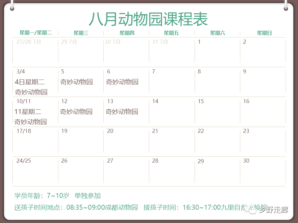 中午 美味午餐,午休,科普书籍阅读 下午 科普沙龙:丰容,制作一款丰容玩具(乡野走廊自然学校) 九里自然体验馆(乡野走廊自然学校)接孩子 上午 探访成都动物园的鹿:成动的鹿阵容豪华,有包括毛冠鹿、豚鹿、白唇鹿等中国本土鹿类。(成都动物园) 中午 美味午餐,午休,自然纪录片观赏与讲解 下午 兽骨乐高,亲手拼出一个完整的兽骨(乡野走廊自然学校) 上午 探访成都动物园的大猫。第一天制作的丰容玩具,将会在今天上午放给动物们玩耍。(成都动物园) 中午 美味午餐,午休 下午 自然剧场,结营仪式(乡野走廊自然学校) 九里自然体验馆(乡野走廊自然学校)接孩子 地址:金牛区九里堤街道长青路112号二楼 九里自然体验馆(乡野走廊自然学校)为独栋的自然教育场所,教学面积超过300㎡,馆内有丰富的教学设备、种类众多的昆虫标本、科学实验设备、自然科普书籍等更是齐备。 每天接孩子的时间为16:30~17:00 若需晚些接,提前告诉我们即可。